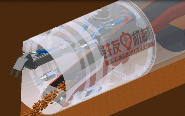 挖掘式頂管機是一種非開挖施工工藝,當頂管機前端的斜面(上凸下縮,有效控制和預防泥土塌落)進入土層中,頂管內(nèi)部的挖掘斗通過液壓機械臂(挖斗油缸和變幅油缸的行程)的變化,將頂管機上部泥土挖掘下來,挖掘下的泥土匯集在機頭下部皮帶輸送機位置,啟動皮帶輸送機,輸送帶將泥土輸送到電動小車(可調(diào)速)上,小車將泥土從工作井送出指定地點,在機頭后頂入水泥管,這樣在工作井和接受井間鋪設(shè)一條水泥管道。
